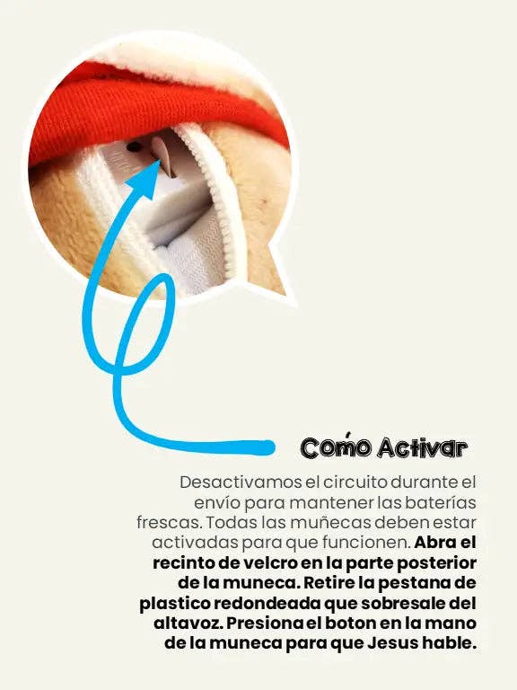 Dale a tu hijo el regalo de Jesucristo con El Muñeco de Jesús Parlante. Los brazos extendidos de Jesús y su cálida sonrisa le dan la bienvenida a tu hijo. A los niños les encanta apretar la mano de Jesús para hacerlo hablar. A los padres y abuelos les encanta que sus hijos estén aprendiendo las Escrituras. Su hijo aprenderá 18 de las lecciones más importantes de Jesús de la Biblia, incluyendo El Padrenuestro y Juan 3:16. Esto es más que un juguete, es una herramienta fundamental para criar niños en Cristo. Enseñe a sus hijos antes de que el Mundo lo haga.