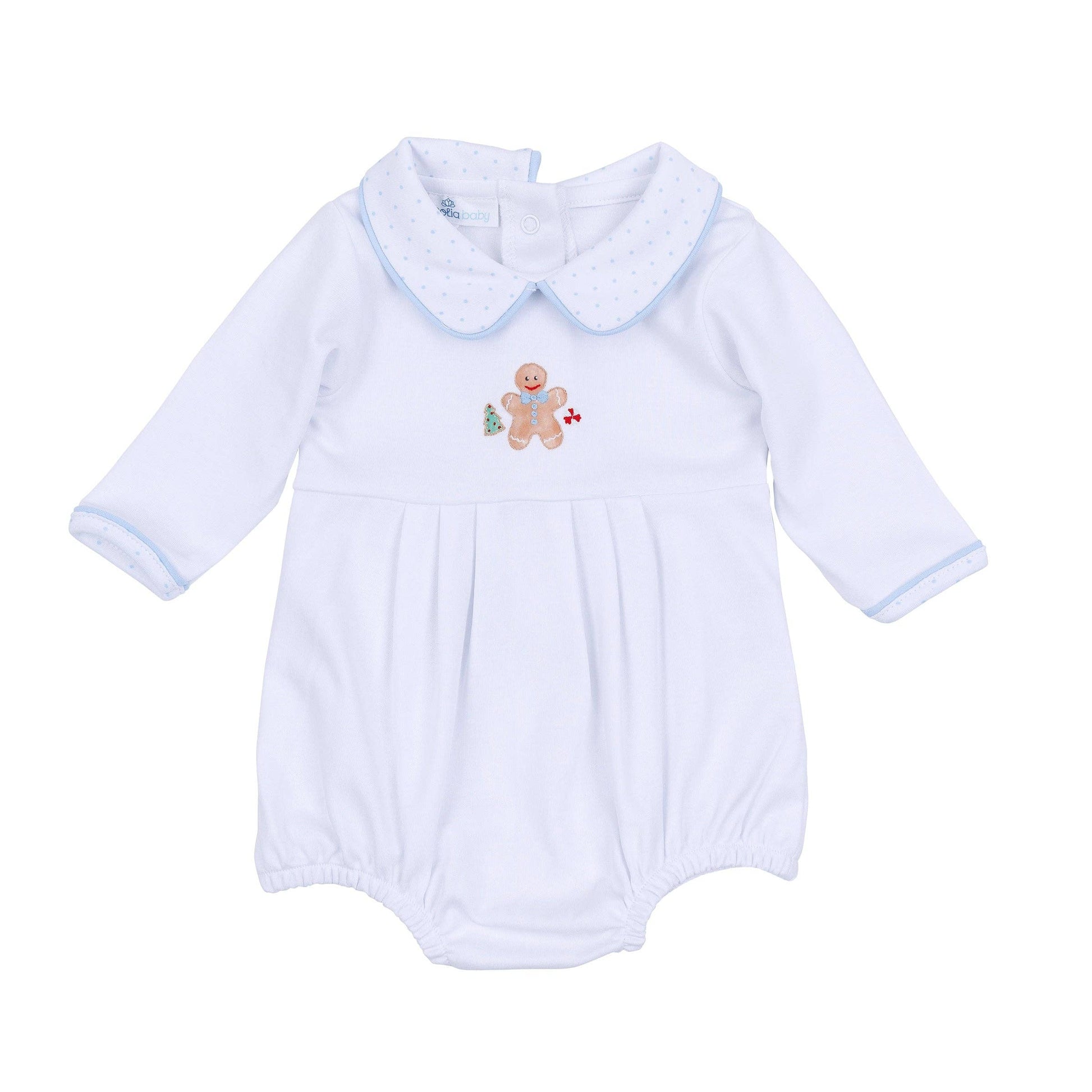 Celebrate the Christmas season in this delightful long sleeve bubble, crafted from luxurious Pima Cotton. It features a festive gingerbread boy, a charming collared minidots top with ruffles, and long sleeves, providing a cozy and stylish outfit for holiday celebrations.